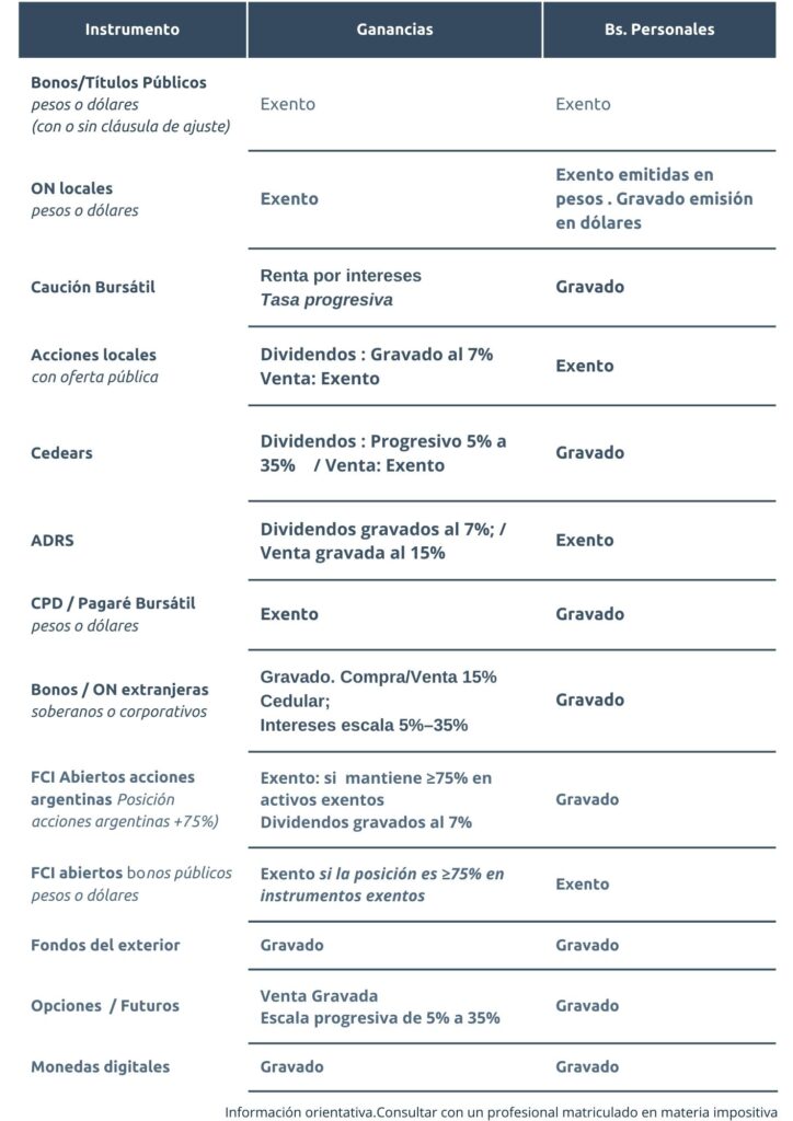 | Impuesto sobre los Bienes Personales (IBP) | Grava el patrimonio o la valuación del instrumento al 31 de diciembre de cada año fiscal. |